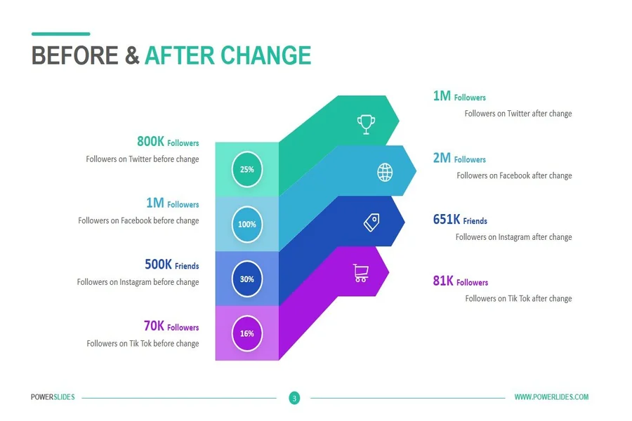 In order to use before-and-after examples, you have to select the appropriate metrics. Show the growth in the number of followers, the rate of engagement, the number of reached, and the impressions. To be more impactful, you can also add the secondary benefits, like more website clicks, more comments, or more content found.